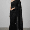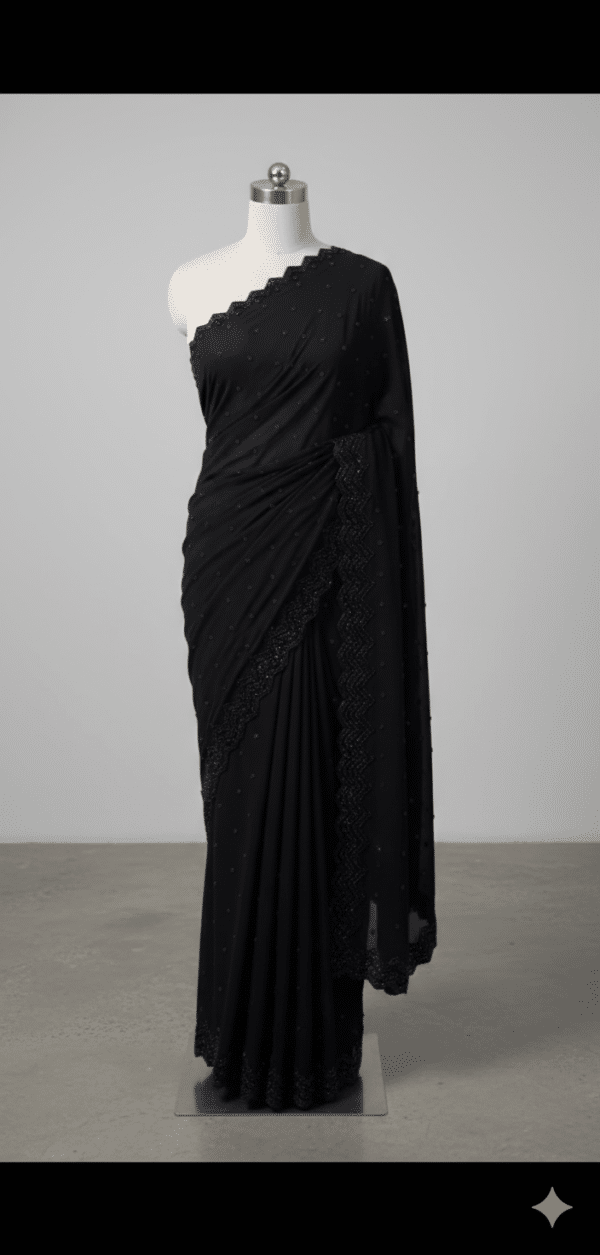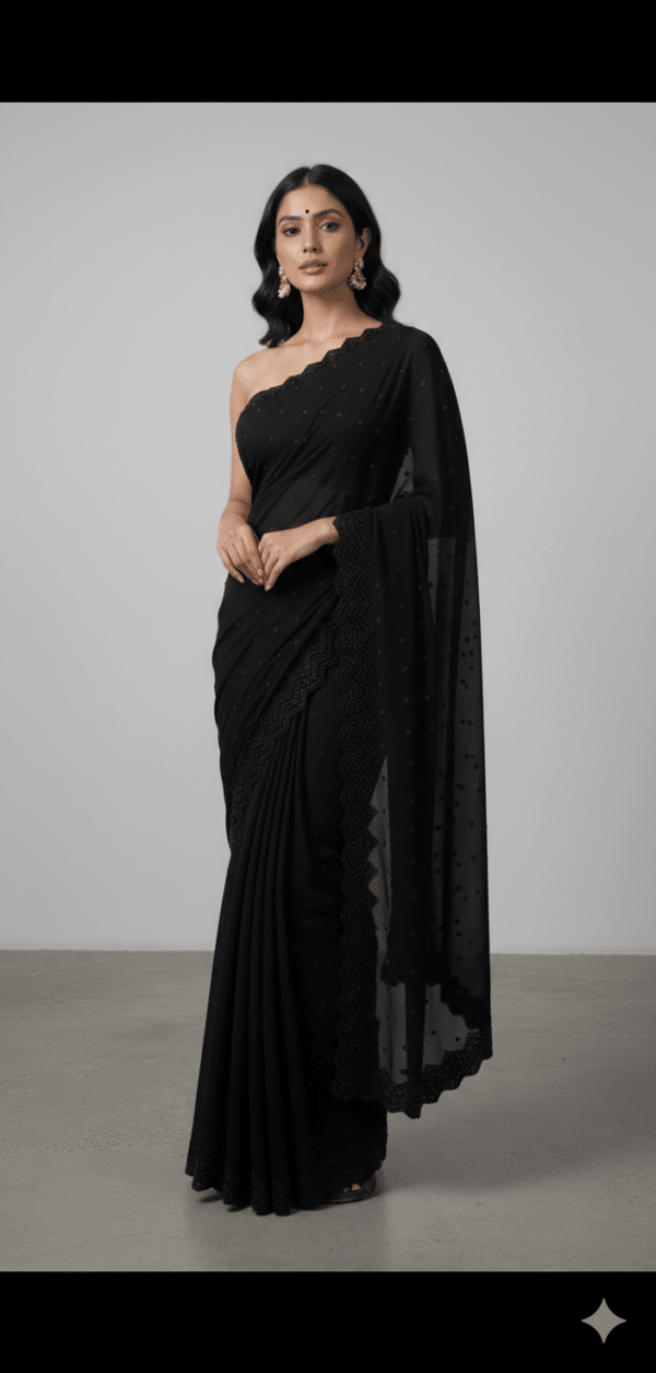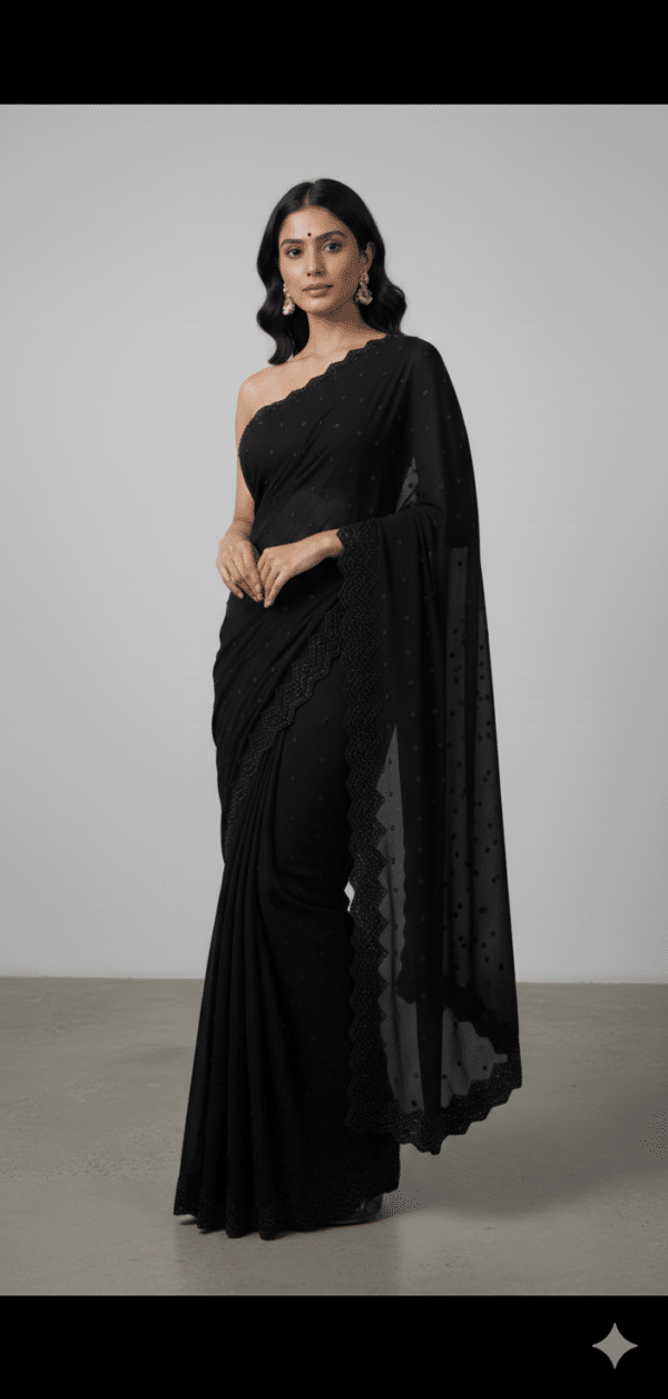 The Noir Elegance Premium Black Saree is made for women who love minimal yet luxurious fashion. The rich jet-black color combined with delicate dotted detailing and scalloped border creates a sophisticated modern look.