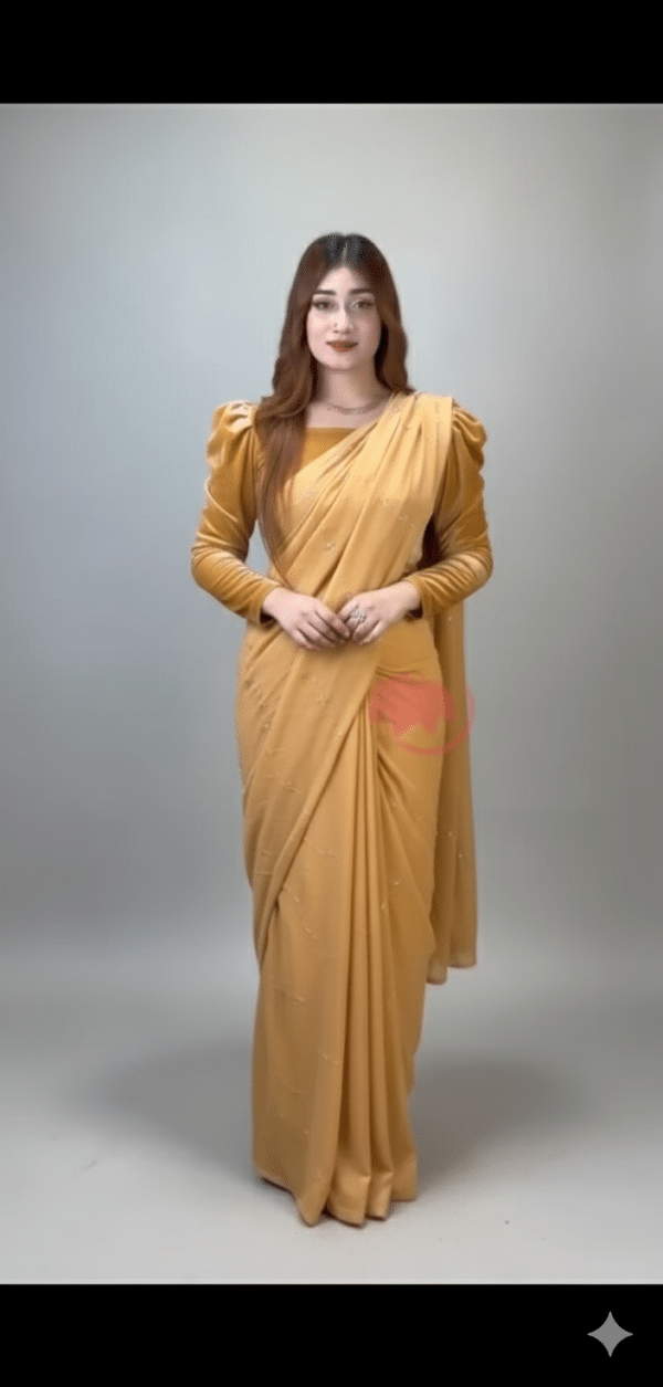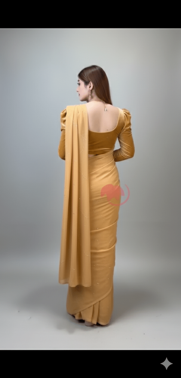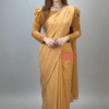The warm golden shade gives a soft glowing appearance which looks stunning in daylight and indoor lighting both. The saree drapes smoothly and naturally enhances body shape.