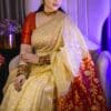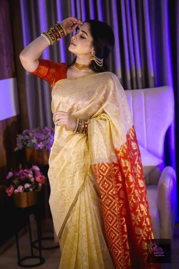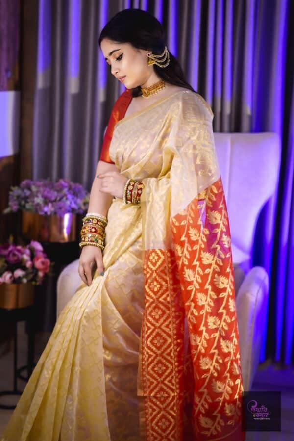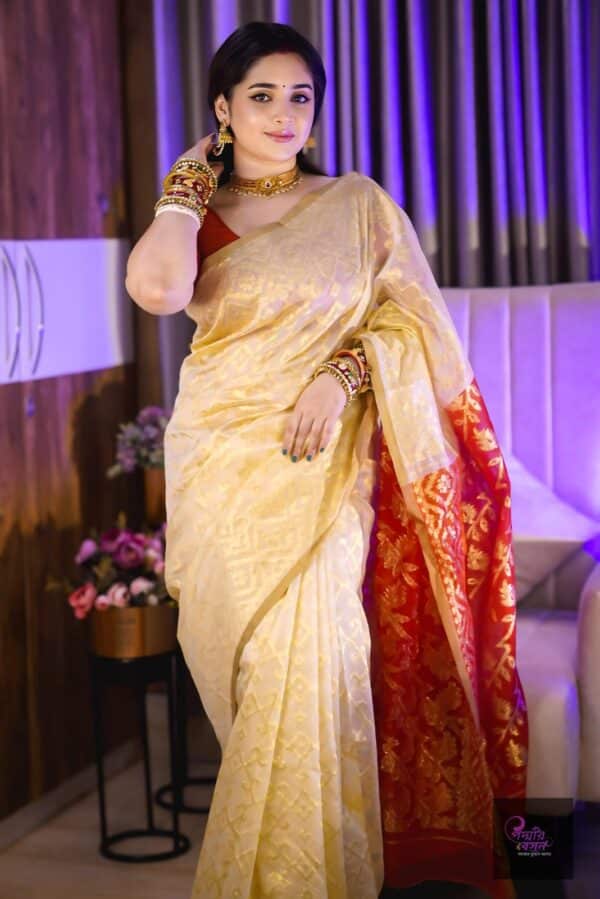 এই শাড়িটি তৈরি করা হয়েছে যত্ন ও নিখুঁত কারুশিল্পে, যা আপনাকে দেবে আভিজাত্যের অনন্য অভিজ্ঞতা। পূজোর দিনে আপনার প্রতিটি পদক্ষেপকে করে তুলবে আরও গৌরবময়।