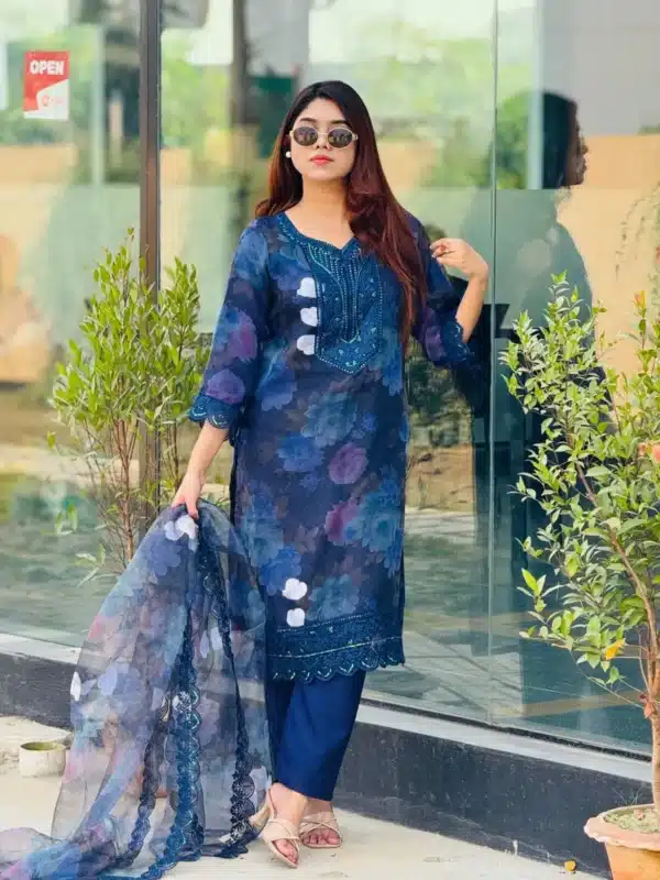 ডিপ মিডনাইট নেভি ব্লু বেসের উপর ডিজিটাল প্রিন্টে ফুটে উঠেছে অসংখ্য ফুল — নীল, বেগুনি, পিচ ও গোলাপির এক অপূর্ব মিশেলে। এই ফুলগুলো এতটাই বাস্তবসম্মত যে মনে হয় যেন রাতের বাগান থেকে সরাসরি উঠে এসেছে কাপড়ের উপর। প্রতিটি ফুল, প্রতিটি পাপড়ি — যেন একজন শিল্পীর সূক্ষ্ম তুলির আঁচড়।
