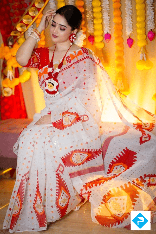 🌸 ঐতিহ্যবাহী সাদা-লাল পূজার শাড়ি